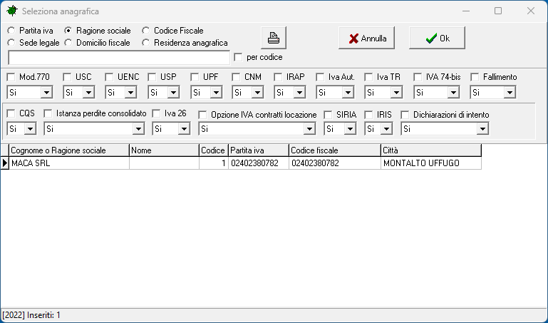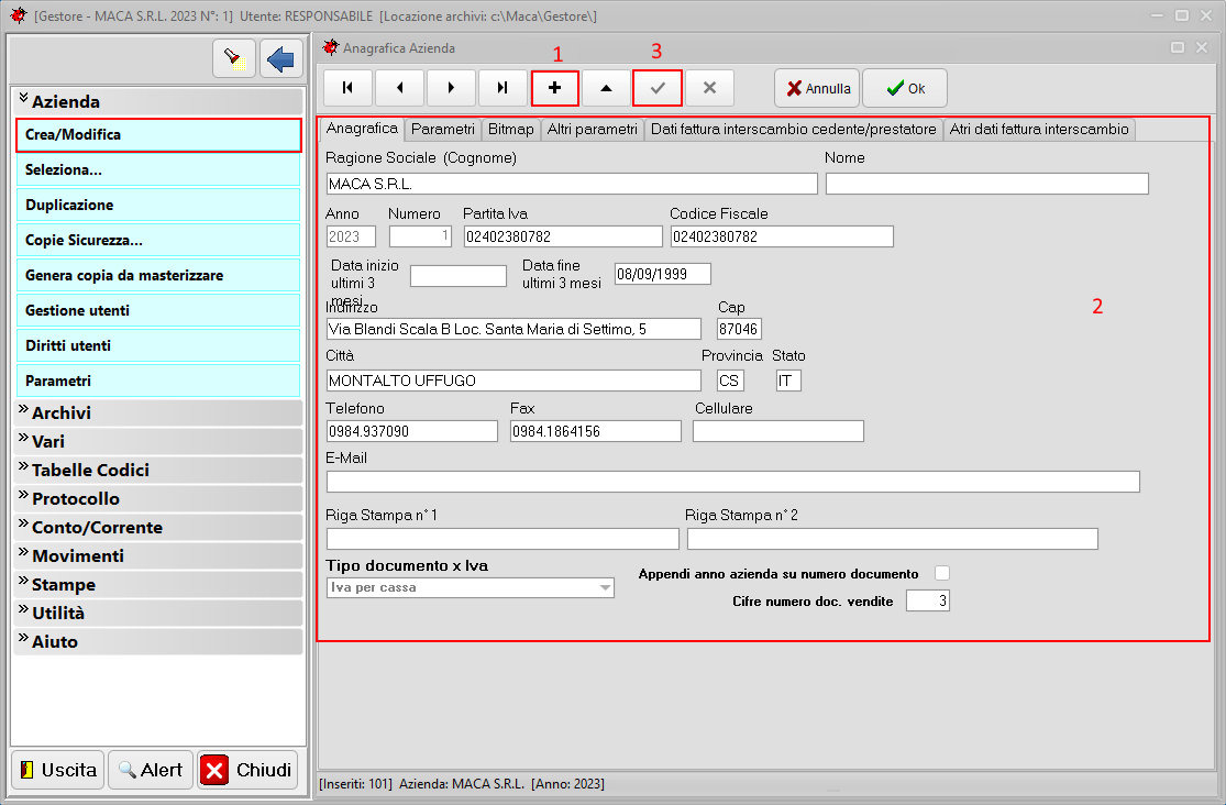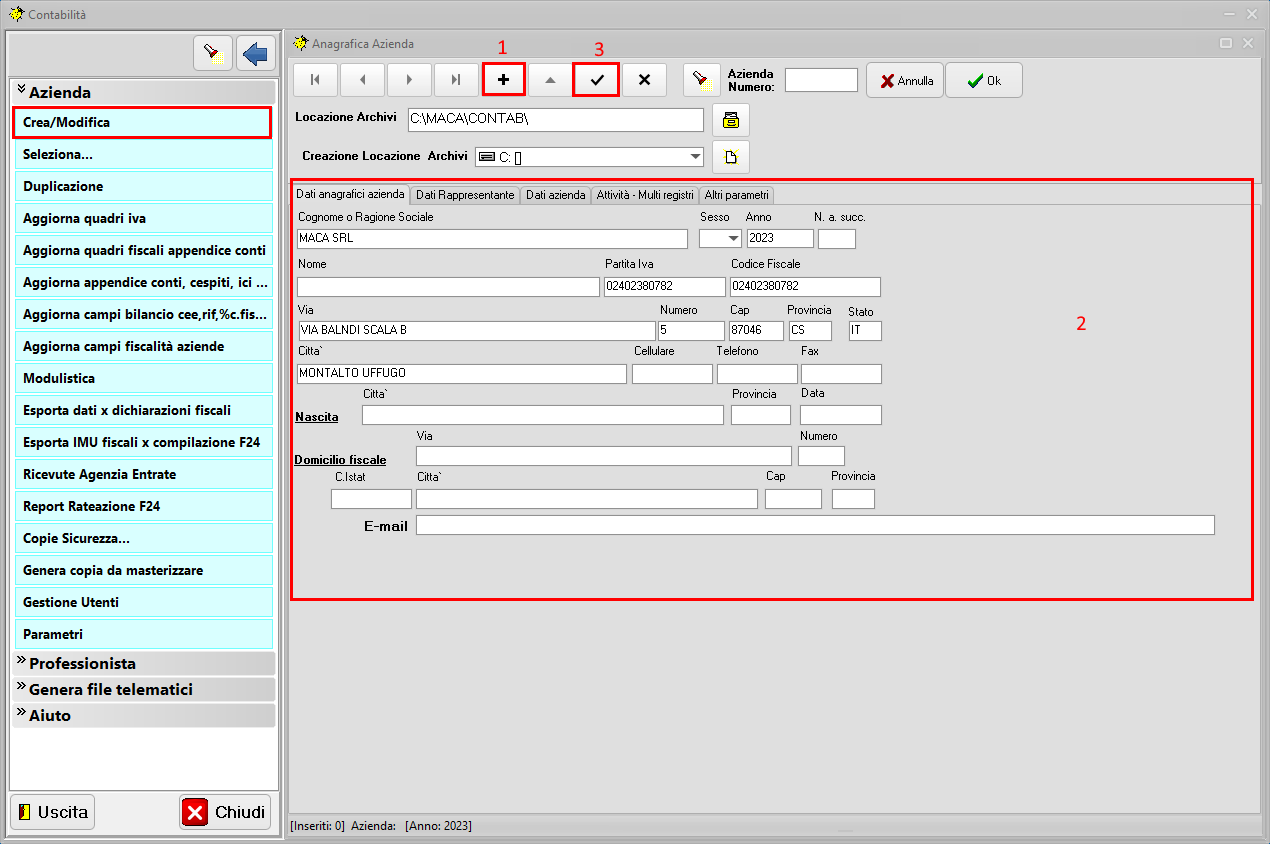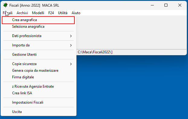 Permere sulla voce del menu Fiscali, Crea Anagrafica per creare l'Anagrafica dell'azienda/soggetto.