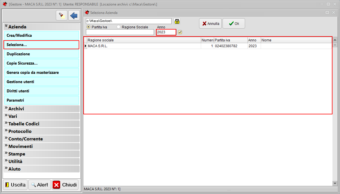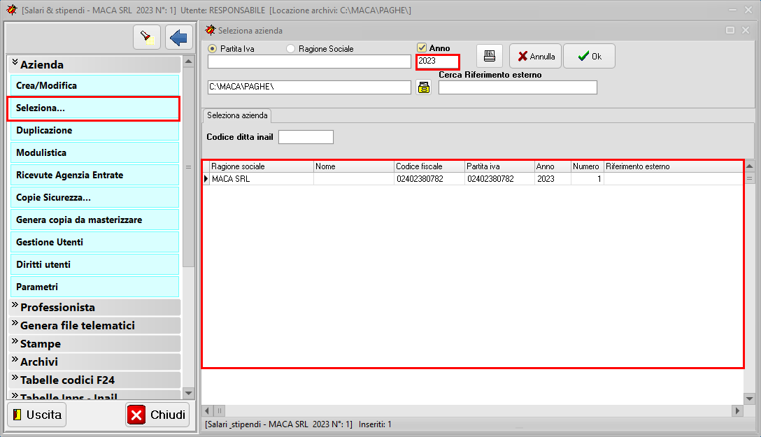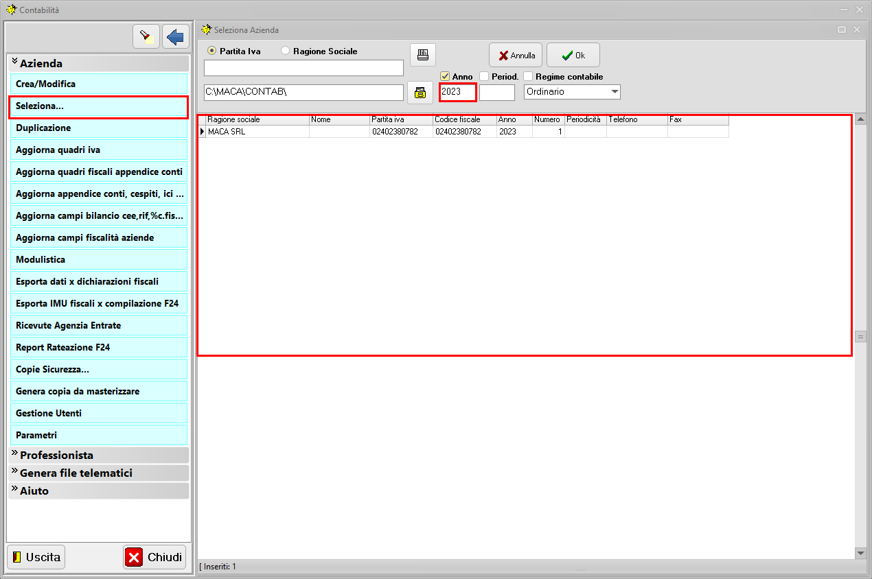 Selezionare l'Azienda creata precedentemente da Azienda, Seleziona.