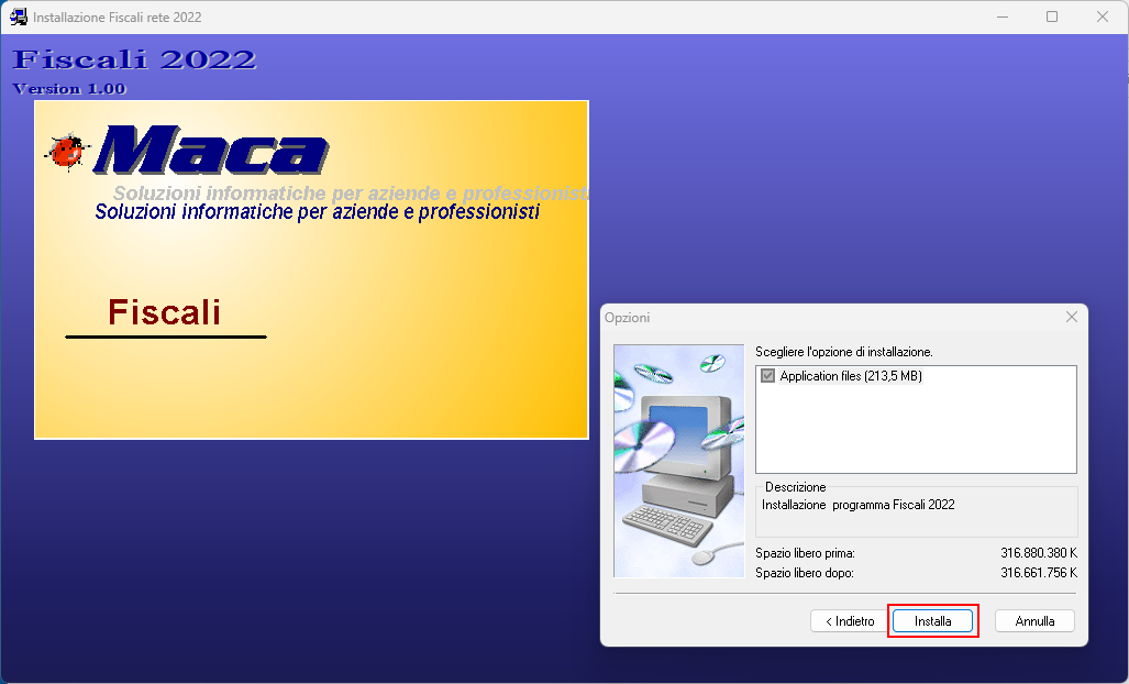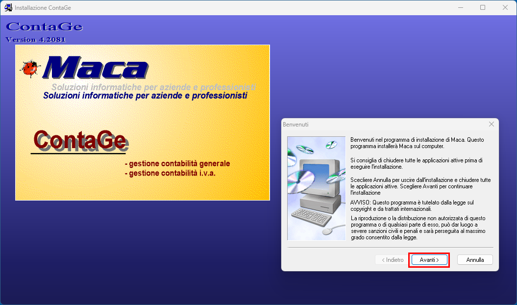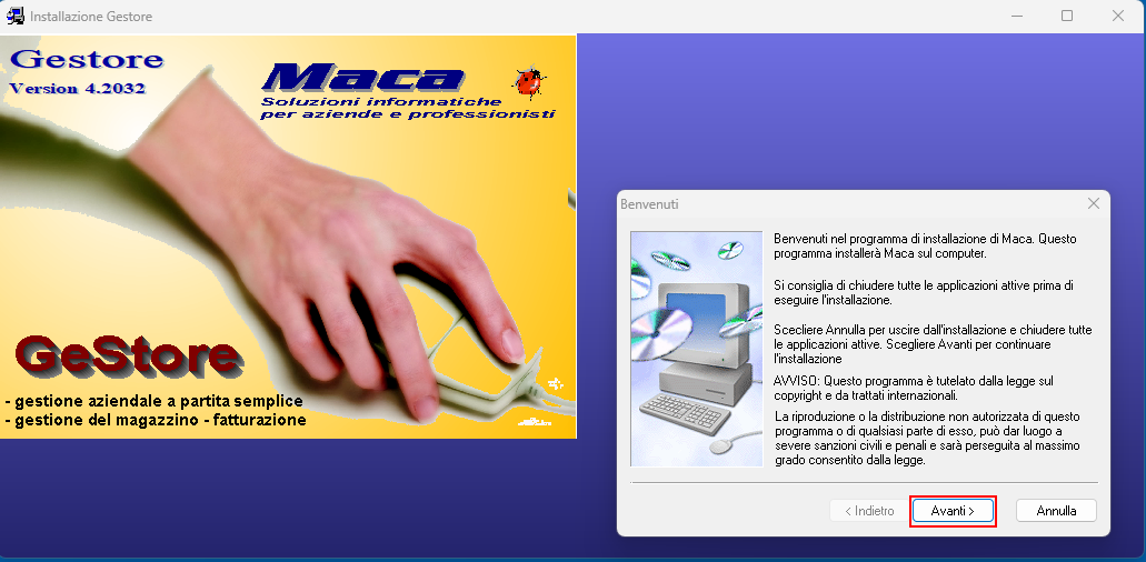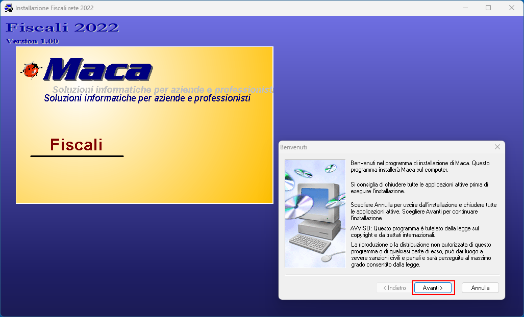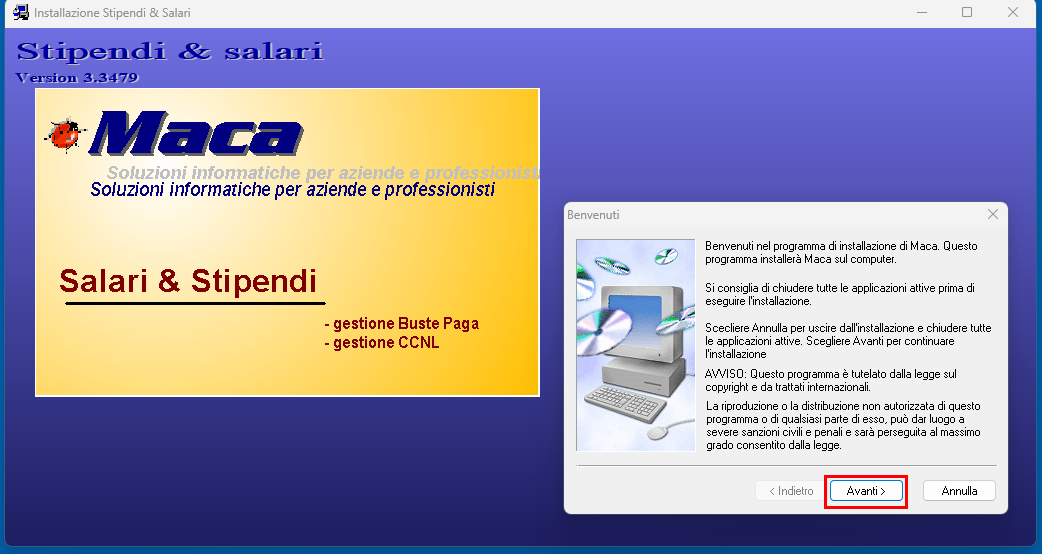 Premere Avanti per dare autorizzazione ad installare il software Maca.