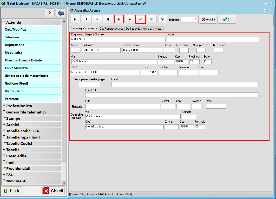Premere su + per inserire nuova anagrafica azienda e compilare i campi. Premere il pulsante della spunta per salvare modifiche.